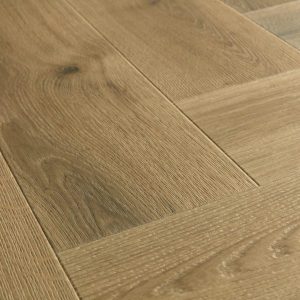 Thiết kế vát cạnh Authentic Bevel làm nổi bật từng thanh sàn, tạo chiều sâu thị giác và cảm giác chân thực như gỗ tự nhiên. Kiểu lắp đặt herringbone (xương cá) mang lại bố cục hài hòa, góp phần tạo điểm nhấn tinh tế cho phòng khách, khu bếp – ăn và các không gian sinh hoạt cao cấp.